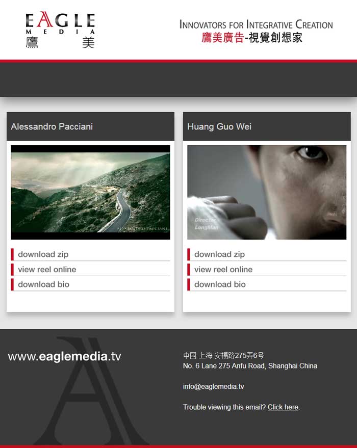 Eagle Media is a film production company who has been shooting commercials for clients from all over the world, including Mercedes Benz, BMW, Audi, Jeep, Lexus, Skoda and more. I handled web design, server setup and the graphic design of their email video delivery system.