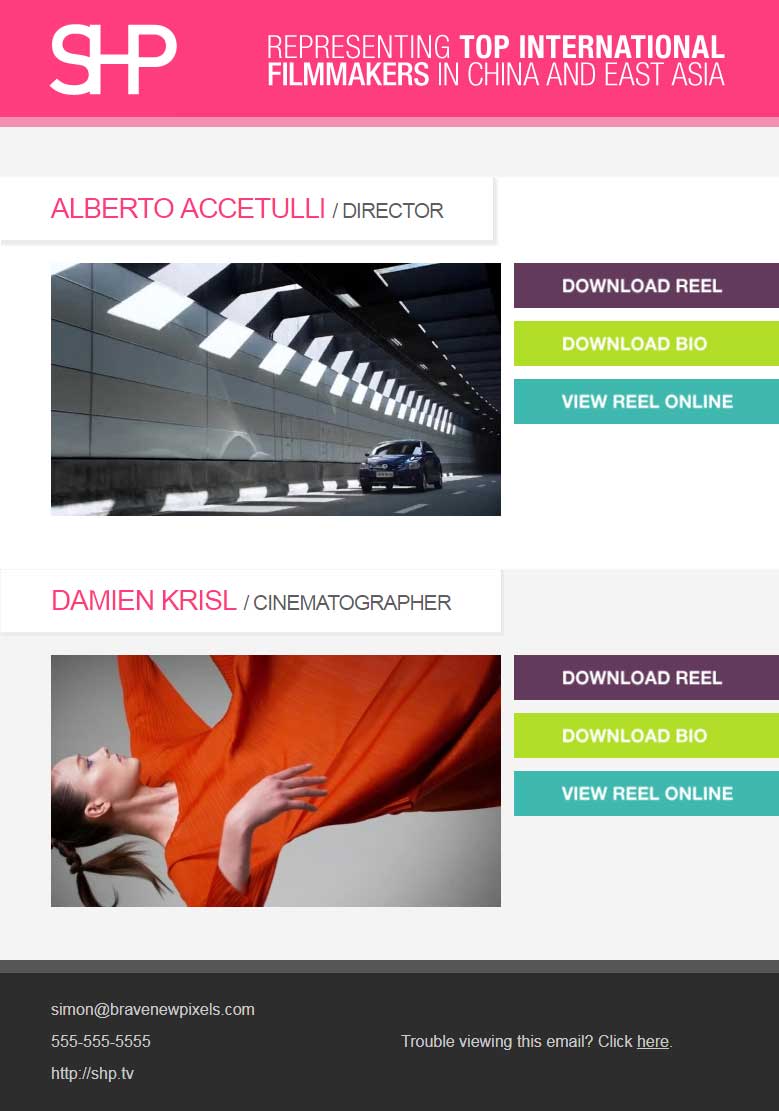 SHP is the first and the biggest full-service rep agency in China to represent film professionals in Asia’s Advertising industry. I built a video delivery system allowing them to select from an uploaded library of film reels and send chosen videos to their clients in a branded email.